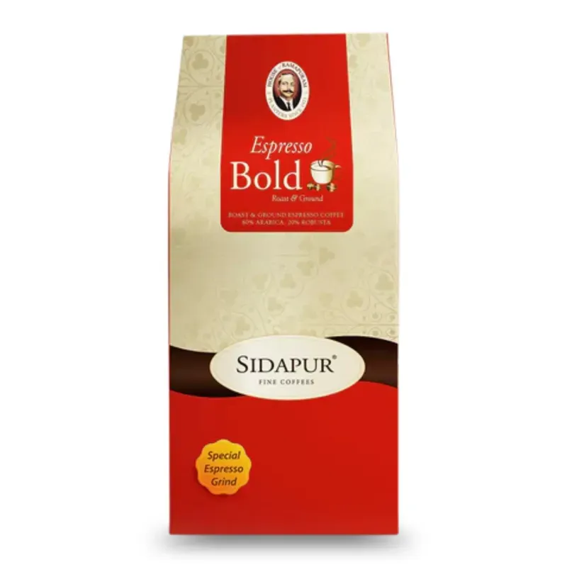 Premium Roast & Ground Espresso Coffee. Medium Dark Roast. Sidapur – Ground Espresso Bold is a select blend of the finest Arabicas from Chikkamagalur with a touch of the best Robustas from Coorg. Carefully selected, roasted, blended and ground to bring out an intense aroma and a thick, reddish brown crema, Sidapur – Ground Espresso Bold produces a fine & full bodied brew with balanced acidity, bitterness and sweetness of coffee, with notes of chocolate. Sidapur – Ground Espresso comes to you in airtight packs with a freshness valve that helps retain its aromatic flavours. Once opened, store in an airtight container to preserve freshness.
